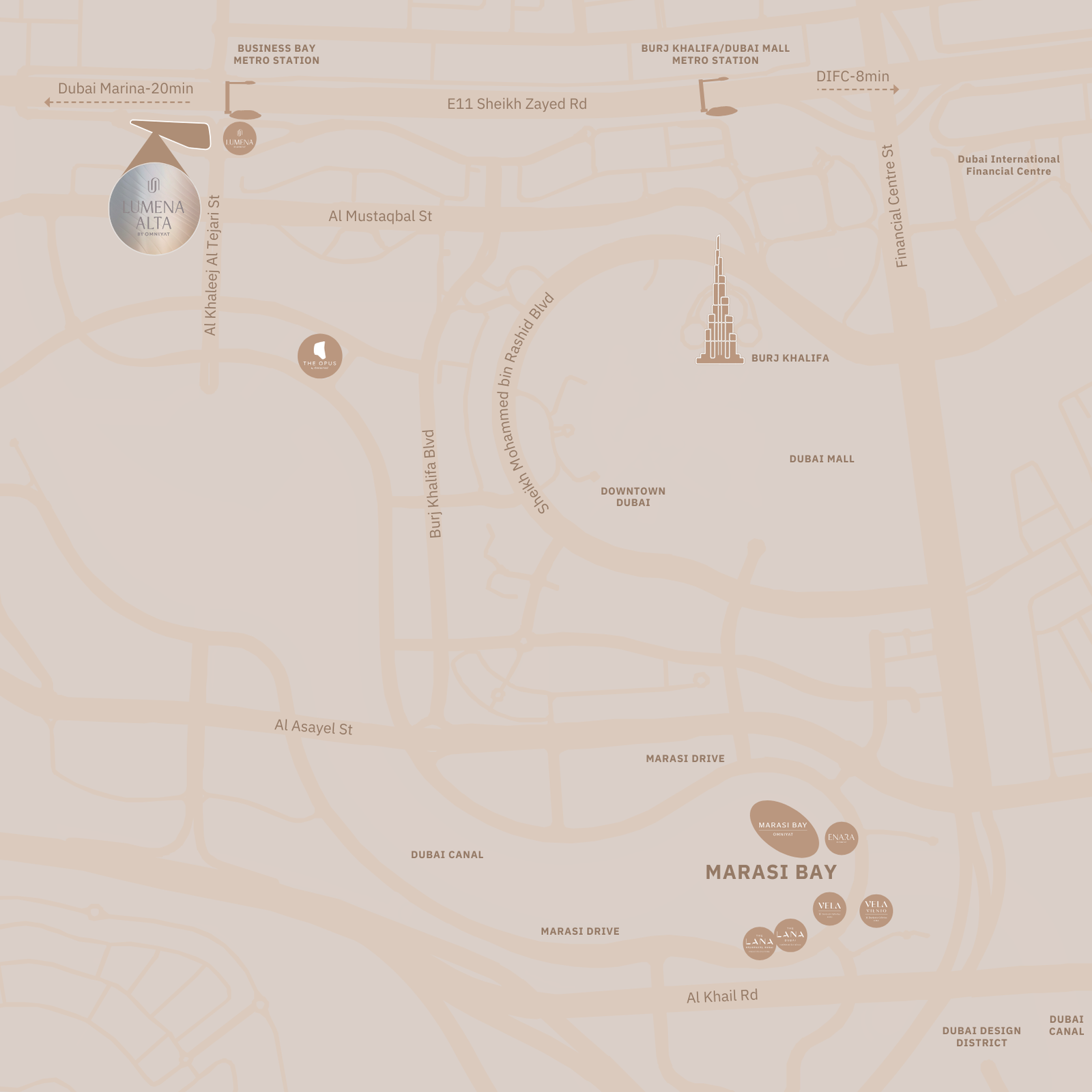 LUMENA ALTA is positioned at the gateway to Business Bay, offering seamless access to Sheikh Zayed Road, DIFC, Downtown Dubai, and major transport links.